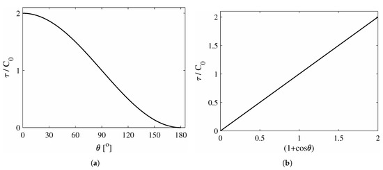 Two forms of the general relation between ice adhesion strength τ and water contact angle θ on a generic surface with properties C0; (a) Normalised ice adhesion strength as function of the cosine of the contact angle (1 + cos θ); (b) Normalised ice adhesion strength as function of the cosine of the contact angle (1 + cos θ). The relation is described by Equation (7).