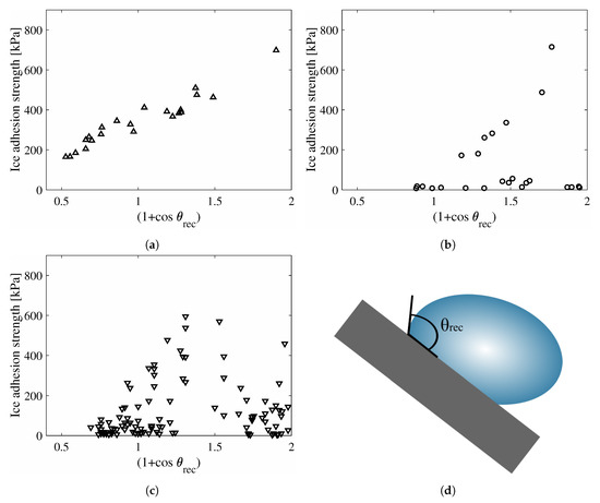 strength for a collection of surfaces; (a) Results from Meuler et al. [22], with 22 samples. Adapted with permission [22], 2010 American Chemical Society; (b) Results from He et al. [18], with 24 samples; (c) Results from Golovin et al. [38], with 108 samples. Ice adhesion is average value; (d) Illustration of receding contact angle compared to the equilibrium contact angle in Figure 1. The relation from Equation (7) and Figure 2b is clearest for (a), and can be seen for higher ice adhesion strengths in (b). The relation cannot be seen in (c). The definition of the receding contact angle is shown in (d).