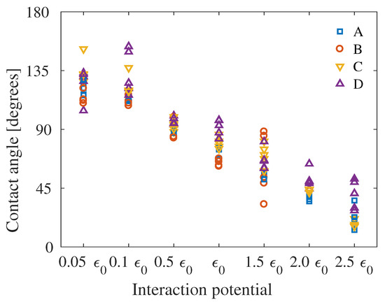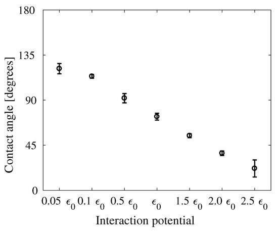 Water contact angle as function of the interaction potential for the System A. The values of can be found in Table 1.