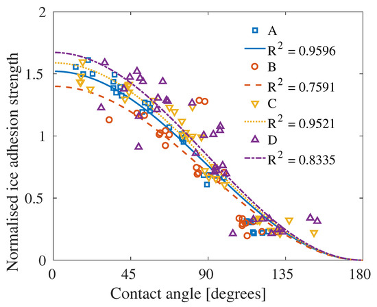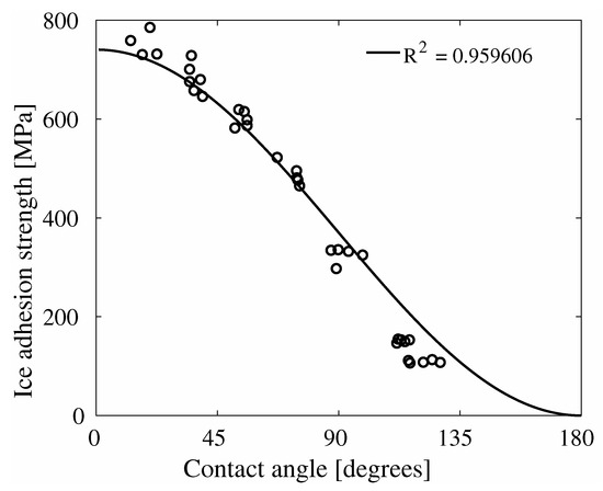 Ice adhesion strength as function of contact angle, with the relation from Equation (7) fitted to the data. It can be seen that the fit of the general relation shows a very high level of significance.