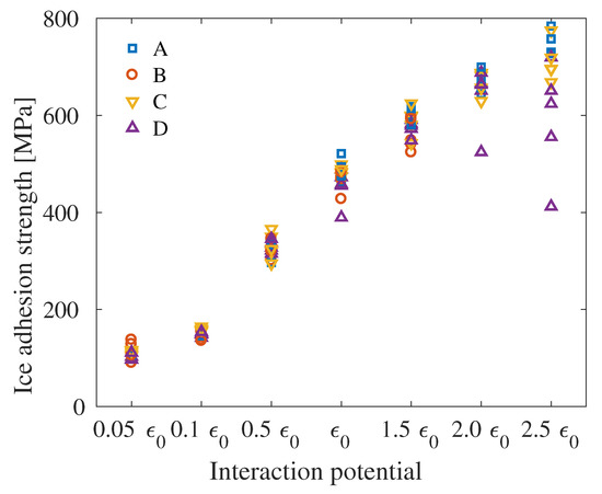 The ice adhesion strength as function of the interaction energies is shown in Figure 9. It can be seen that the ice adhesion strength is very similar for all systems, with the greatest variance at the highest interaction energy. Furthermore, System D displays larger differences of measured ice adhesion strength than for each interaction energy than the other systems.