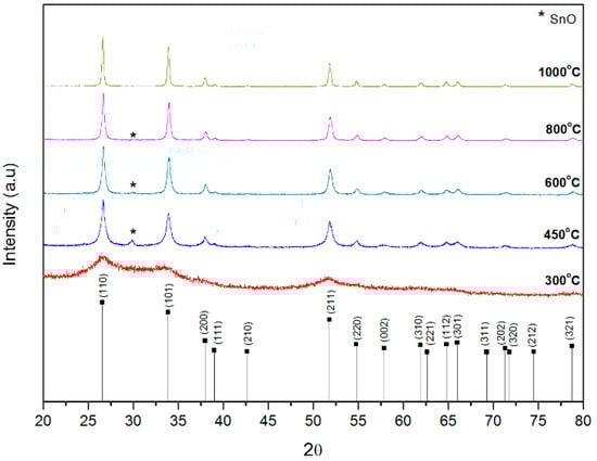 Figure 1 presents the X-ray diffraction patterns of SnO2 particles annealed at different temperatures. The XRD pattern at 300 °C shows that the crystallization process has begun, as the presence of SnO2 characteristic peaks is observed. From 450 °C, it is clear that the SnO2 phase is obtained, however, at 29.87° (*) a peak corresponding to a romarchite (tetragonal) structure (SnO JCPDS 96-901-2141) was detected. SnO is a metastable phase due to its oxygen deficiency [], so it transforms into the more stable SnO2 phase at temperatures above 200 °C [,]. The SnO disappeared completely after 800 °C, as shown in Table 1. The results regarding the SnO content in the samples were obtained by X’Pert High Score Plus software (version 4.8) using the XRD patterns. These results suggest that the oxidation of tin atoms was probably incomplete during heat treatment, leading to the coexistence of the second phase (SnO) in the powder []. All the other diffraction peaks are in good accordance with the standard sample of cassiterite (tetragonal) SnO2 (JCPDS 96-900-9083). To ensure the purity and presence of single-phase SnO2, a powder treated at 1000 °C was used to prepare the coatings.