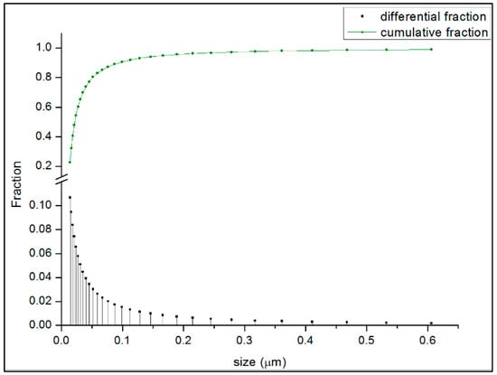 According to the XRD results, the grain size increases proportionally with the temperature. Meanwhile, the agglomeration also increases, as has been shown in some previous studies [,]. In the SEM micrograph shown in Figure 2, particle agglomeration is clearly observed, with aggregate diameters in the range of 100 to 800 nm. This behaviour occurs because the sol-gel and calcination processes are prone to nanoparticle clustering, resulting in poor dispersion. The use of a solvent is beneficial for the dispersion of nanoparticles []. In this work, to determine the particle size, SnO2 was dispersed in ethanol and measurements were obtained in the range of 14 to 69 nm with d50 = 23 nm using the dynamic light scattering (DLS) technique. The distribution of the particle sizes is shown in Figure 3, which presents a mono-modal distribution with a strong tendency toward smaller-sized particles (11–13 nm). On the other hand, with respect to morphology, spherical forms are observed, which is considered an advantage because they have better fluidity and fewer contact interfaces than more irregular particles. When vibrated, smaller particles can occupy vacancies, and thus spherical particles are more easily close-packed []. Therefore, if the particles are nanometric in size, it is expected that nucleation occurs and more zones exist that prevent the passage of the current applied to the system for the corrosion test.