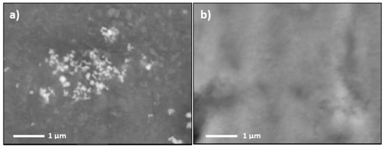 SEM imaging was conducted to obtain qualitative information about the coating’s surface morphology. Figure 4a shows the image of the SiO2 coating modified with SnO2 nanoparticles. For comparison, the SEM image of an unmodified SiO2 coating (Figure 4b) is also included. The micrographs show that the film is homogeneous, continuous, and free of cracks. The clearer points in Figure 4a correspond to SnO2 nanoparticles.