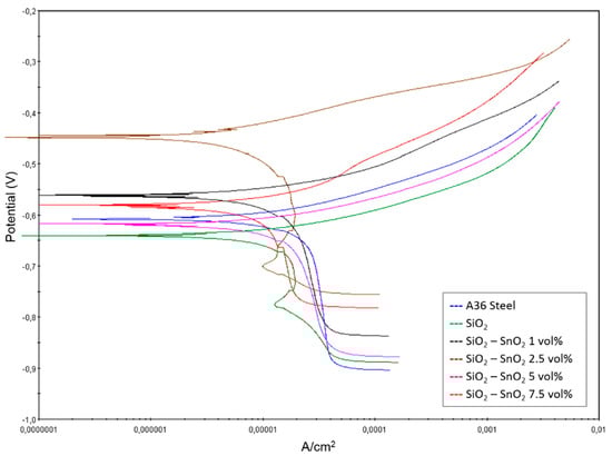 The polarization Tafel method was applied to analyse the inhibitor efficiency of the coatings. Figure 5 represents typical anodic and cathodic potentiodynamic polarization curves for carbon steel carried out in the absence and presence of SiO2 coatings with various concentrations of SnO2 particles. The figure shows that in saline solutions, the presence of SnO2 in the coating on the metal’s surface shifts both the anodic and cathodic sections of the Tafel plots to lower values of current density at all investigated SnO2 particle contents. The corrosion current density decreased from 25.43 µA·cm−2 for the bare A36 steel to 6.01 µA·cm−2 for the most effective coating (2.5 vol %). These results indicated that the coatings displayed better barrier properties in the NaCl environment and inhibited the reactions associated with corrosion processes []. The same trends found in the resistance polarization test results were also observed in this analysis. In this case, the plots show that the curve corresponding to 2.5 vol % of SnO2 nanoparticles had a smaller slope than for other samples and therefore had a decreased current density.