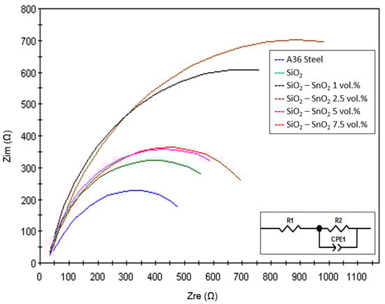 Silica coatings improve the corrosion resistance due to the formation of protective oxides that act as a barrier to oxygen diffusion to the metal surface []. As shown in Figure 6, the Nyquist plots of the coatings in the NaCl solution exhibit an increasingly large semicircle with additional SnO2 nanoparticles. The corresponding R2 values also increase evidently, however, the same behaviour was obtained, so the test indicates that there is an ideal concentration of SnO2 for corrosion protection.