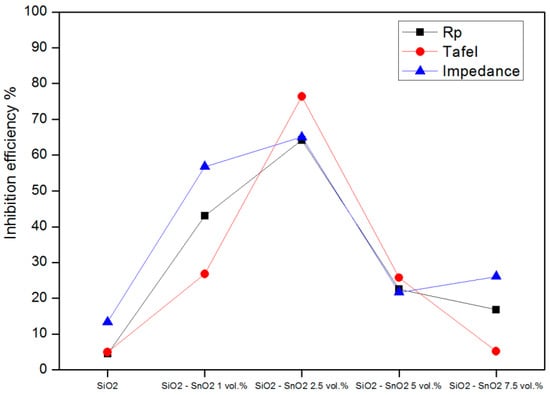 In order to get a better understanding of the corrosion behaviour of the coated samples, the inhibition efficiencies obtained from the three methods were compared (Figure 7). It is clear that for all three electrochemical techniques, the coating efficiency follows the same trend for each concentration compared with the substrate. All the coatings present protective corrosion properties for the A36 steel. Apparently, the coating layer on the surface of the carbon steel prevented iron from reacting with the corrosive media in all of the study cases. The results also indicated that the SiO2 coating material should completely isolate the substrate from the corrosive media so that no electrochemical reactions occur at the coating-substrate interface. From this viewpoint, a good protective coating should be as dense as possible so that the corrosive medium cannot penetrate through it. With this basic knowledge, we can conclude that the poor anticorrosion ability in some coatings may have been due to the presence of pores which allowed the corrosive media to penetrate through.