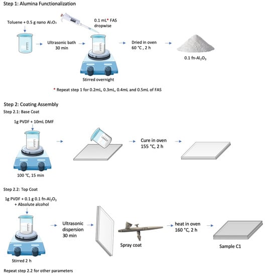 Once the base coat was ready, 1 g of PVDF and 0.1 g 0.1 fn-Al2O3 were dispersed in 10 mL absolute alcohol for 2 h followed by ultrasonic dispersion for 30 min. The dispersion was sprayed on top of the base coat and heated in an oven at 160 °C for 2 h to form the top layer. The processes were repeated with different fn-Al2O3 parameters including pristine Al2O3 as reference sample (i.e., 0.0, 0.2, 0.3, 0.4, 0.5 fn-Al2O3). Subsequently, the sample was denoted as C0, C1, C2, C3, C4, and C5. The experimental procedure is summarized in Figure 1.