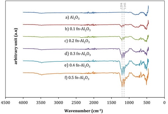 Figure 2 shows the FTIR spectra of pristine and functionalized Al2O3 (fn-Al2O3) with different amounts of FAS. The characteristic bands within 821 and 527 cm−1 are attributed to pristine Al2O3. The presence of alkylsilane characteristic bands between 1300 and 900 cm−1 confirms the successful functionalization of the nano alumina with FAS. The prominent bands at 1204 and 1145 cm−1 corresponds to the specific vibration bands of the perfluorinated chains group. The intensity of the band increases with the FAS amount is in agreement with previous reports [,].
