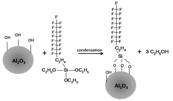 The mechanism of Al2O3 surface functionalization where condensation reaction between Al2O3 and FAS yields functionalized Al2O3. Adapted with permission from []; Copyright 2013 Elsevier.