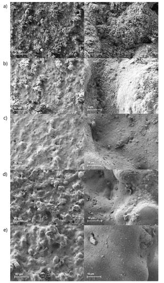 FE-SEM micrograph of coating surface with different magnification with respect to FAS amount (a) C1, (b) C2, (c) C3, (d) C4, and (e) C5. The morphology shows micro-bumps, which contribute to the roughness while C1 and C2 exhibit hierarchical structure.