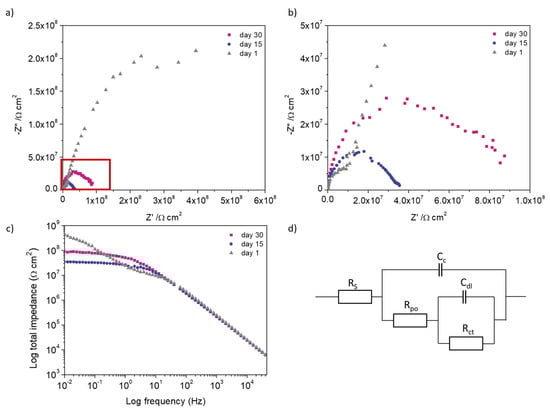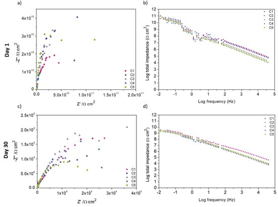 EIS data for the first day and day 30; (a) Nyquist and (b) Bode plot for the samples on the first day of measurement. The data is scattered and roughly forms semicircle. (c) Nyquist and (d) Bode plot on day 30 of measurement shows data is more defined and smoother.