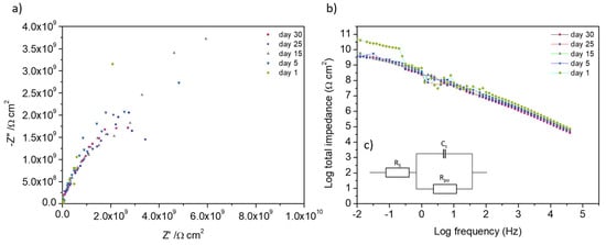 (a) Nyquist and (b) Bode plot of electrochemical impedance spectroscopy (EIS) measurement for selected days for sample C1 and (c) the equivalent circuit.