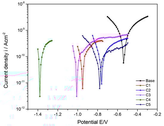 Potentiodynamic polarization measurement was conducted to assess the corrosion rate and is presented in Figure 9. The value of Icorr obtained for the base coat was 1.17 × 10−10 A cm−2 but decreases to 1.67 × 10−11 A cm−2 for coating C1. The lower Icorr value corresponds to a greater corrosion resistance of the coating [].