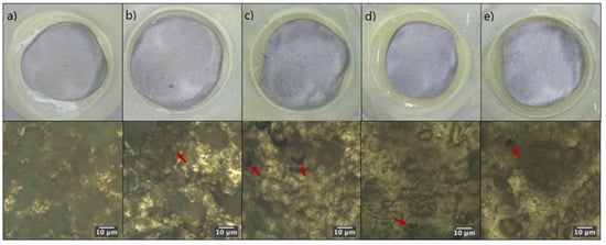 Picture of the exposed area on day 30 for sample (a) C1, (b) C2, (c) C3, (d) C4, (e) C5, and their respective optical micrograph (100×). The red arrow shows a possible pinhole corrosion area.
