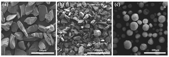 Tri-layer Si/3Al2O3-2SiO2(Mullite)/Yb2SiO5 dense environment barrier coatings was deposited in SiCf/SiC CMC (2 mm × 3 mm × 50 mm) by PS-PVD. Before spraying, the substrate was cleaned with ethanol. The thickness of Yb2SiO5 top layer, Mullite transition layer and Si high-temperature oxidation resistant bonding layer were all controlled within 50 μm. In order to make the powder conductive, the powder was spread flat on the conductive tape and sprayed with gold to obtain its microstructure. Si (99%, −75 + 15 µm, signed 4810, see Figure 1a) and Mullite (99.9%, −45 + 5 µm, signed 6150, see Figure 1b) powder for spraying were purchased from Oerlikon-Metco Ltd. (Freienbach, Switzerland). In addition, agglomerated Yb2SiO5 powders (−40 + 10 µm, Figure 1c) were prepared during this work through spray drying. Before deposition of each layer, the substrate was preheated (Si at 500 °C, Mullite at 1000 °C and Yb2SiO5 at 830 °C) to avoid any defects such as microcracks which can be caused by the excessive stress due to phase change during the deposition process. The specific spraying parameters are shown in Table 1.