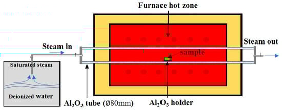 Prior to the water vapor corrosion, the as-sprayed coating needs to be oxidized at 1300 °C for 3 h [21]. Then, the heat-treated sample was placed in the steam corrosion device as shown in Figure 2 for 200 h at 1300 °C. The steam velocity in the tube furnace was about 0.2 m/s.