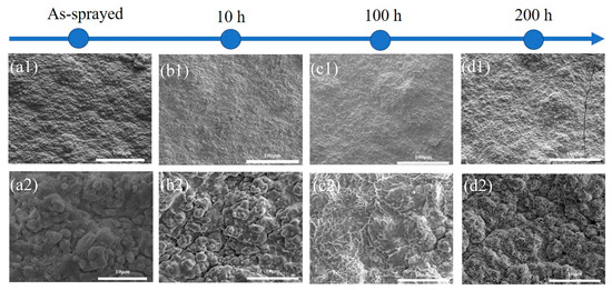 Figure 5 shows the surface microstructure evolution of the coating under different vapor phase corrosion time. As shown in Figure 5a1, the coating in the spraying state is relatively dense, with a small amount of molten micro-plane particles deposited on the surface. The enlarged shows that the surface is mainly composed of agglomerated nanoparticles due to the dispersion of agglomerated Yb2SiO5 powder in the carried gas and plasma. This has changed from solid to gas-liquid mixed phase and then was formed by recrystallization. In longer corrosion time, no obvious change in the coating surface is observed by the low power scanning electron microscopy (SEM). However, observing the surface corrosion of the steam after 50 h under the high magnification SEM shows that the number of grains had been significantly decreased and the microcosmic surface has changed to smooth oxide form (i.e., silica and ytterbium oxide). The internal coating reacts with water vapor on the surface and forms a few escape holes. After 100 h corrosion, Yb2SiO5 sample is oxidized in the steam environment and there is obvious contrast bulge at the grain boundary on the surface. These ridges were formed by the volatilization of silica in the unstable corrosive medium Yb2Si2O7, leaving a stable Yb-monosilicate [13]. After 200 h of steam exposure, it can be seen from Figure 5d1,d2 that the ridge structure gradually decreases, and a few cracks are appeared on the surface. The porous structure increases the brittleness of the coating and produces stress cracks. In addition, a large number of discrete bright spot particles can be observed under the high power scanning electron microscope since corundum tube is exposed to the high-temperature steam over a long period of time. Alumina also reacts with the water vapor to produce gas products, which are transferred to the coating and react with the coating surface to form nanoparticles.