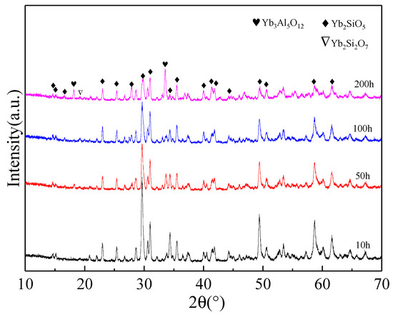 The surface phase is mainly dominated by Yb2SiO5 and Yb2O3 before the corrosion. After water vapor corrosion, the Yb2SiO5 and Yb2O3 content in coating surface significantly decreased, especially the Yb2O3 which is no residue on the surface. At 200 h corrosion, the Yb3Al5O12 peaks appear because under the environment of high temperature and water vapor, Yb2O3 reacts with water, as well as with Al2O3 from the corundum tube (Equations (4) and (5)). The results are consistent with Richards that the corundum tube interferes with the testing process [23]: