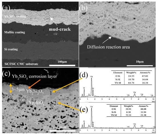 Cross-sectional micrographs of the coatings after 200 h water vapor corrosion: (a) overview EBCs; (b) interface of Yb2SiO5 and Mullite; (c) near-surface of Yb2SiO5 layer; (d,e) Energy dispersive spectrometer(EDS) elemental analysis.