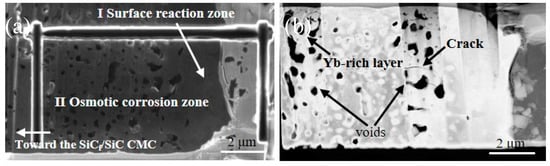 AS-sprayed EBC samples were subjected to the heat treatment at 1300 °C for 3 h and the partially decomposed ytterbium oxide and silicon oxide were regenerated through the solid phase reaction to form stable ytterbium silicate. The sample was placed in the corrosion device shown in Figure 2 (1300 °C, 200 h, 0.2 m/s) and the section morphology after corrosion is shown in Figure 10. The composition and structural evolution of Yb2SiO5 coating under high temperature water vapor were analyzed by TEM. Sample blocks 15 μm deep were excavated on the near-coated surface by FIB. It can be seen that a reaction layer of 3–5 μm was formed on the surface and a network of porous structures formed by steam corrosion exists below the reaction layer. This structure generates greater stress, leading to more microscopic cracks. The Yb2SiO5 coating after 200 h corrosion is divided into two zones—(I) surface reaction zone, which is connected with the external steam environment; (II) vapor permeable corrosion layer, where the vapor permeated into the coating and reacted with the decomposition products Yb2O3 and SiO2 to form Yb(OH)3 and Si(OH)4.