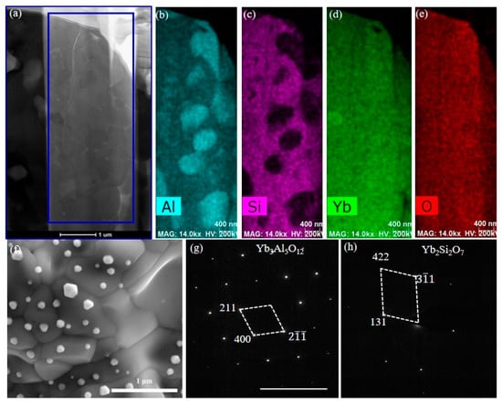 Phase analysis of surface reaction zone I: (a) cross-sectional dark field image of grain growth layer in zone I; (b–e) Al, Si, Yb and O elements EDS mapping of zone I; (f) SEM of surface reaction layer; (g) Selected area electron diffraction(SAED) of rich-Al grains in Zone I and (h) SAED of none-Al grains in Zone I