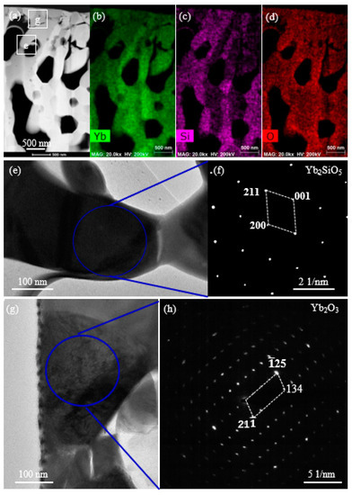 Figure 9 shows the transmission electron microscope (TEM) analysis results of the ytterbium silicate sprayed layer. The layer has light and dark stripes generated by different element distribution. There are also a few holes concentrated near the dark stripes. In order to quantify the element differences in the stripes with different contrast degrees and determine the phase composition of different layers, EDS analysis was conducted. Figure 9c–f also show the element plane scanning and point analysis conducted on the selection in Figure 9b. The results indicate that Yb2SiO5 decomposition did exist in the deposition process. Due to the different gasification temperatures of Yb2O3 and SiO2, the vapor SiO2 formed after decomposition contracted in volume after solidification, so obvious pores were formed. Yb2O3 and Yb2SiO5 are dispersed in the coating seen in Figure 9f.