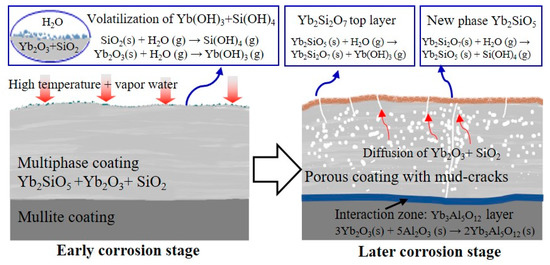 Based on the above characterization and analysis, we established the physical model shown in Figure 13 to reflect the corrosion behavior of ytterbium silicate coating prepared by PS-PVD when exposed to water vapor at 1300 °C for 200 h. The corrosion is divided into two stages—(1) The early stage, due to the thermal decomposition of ytterbium silicate during the spraying process, a large number of Yb2O3 nanoparticles (SiO2 has volatilized) were collected on the surface, which reacted with water vapor first. After the reaction, the coating surface became dense and smooth and the main component was ytterbium silicate; (2) The later corrosion, when Yb2O3 on the surface reaction is completed, the water vapor begins to corrode and permeate along the coating microcrack and the oxide aggregation area decomposed in the coating. At this time, the Yb2SiO5 coating produces a network of porous channels gradually densified from the surface to the inside of it. With the prolonged time of vapor exposure, a large amount of vapor accumulated on the surface of the coating, except a small part of vapor penetrated into the interior of the coating. Combined with the change results of the surface phase and EDS element analysis, it was speculated that a slow reaction occurred on the surface (Equations (2) and (3)) and the transition product Yb2Si2O7 accumulated on the surface, forming a dense equiaxed crystal region. In addition, in the long-term high temperature environment, the interdiffusion zone between Yb2SiO5/Mullite coating interfaces will also occur and Yb2SiO5 and Al2O3 react to form a bar-shaped Yb3Al5O12 [25]. Eventually, corrosion holes in the coating of ytterbium silicate extend into the bonding layer, which will result in the coating and CMC matrix fail quickly.