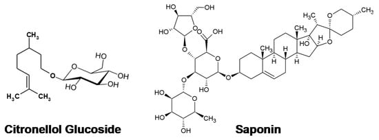 Citronellol glucoside (CG) is the β-d-glucoside of citronellol, an unsaturated monoterpene widespread in plant essential oils and a common flavor used in cosmetics and body care, as well as an aroma compound of food (Citrus sensation). Its glucoside CG is also occurring in crop plants like grape as a storage form of aroma. Recently, it became available by biotechnological production and can serve a dual role as a flavor precursor split by enzymes (e.g., in oral cavity) and as a non-ionic tenside or emulsifier in consumer products. CG is less complex in comparison to saponin with respect to chemical structure(s) and chemical identity. The aglycon of CG is a monoterpene (C10, branched alkene), while that of saponin is a triterpene (C30, substituted ring structures); the glycosidic parts are monosaccharides in the case of CG, while they are oligosaccharides in case of saponin, containing also an ionic carboxy-function. Furthermore, saponin is a mixture of triterpene glycosides.