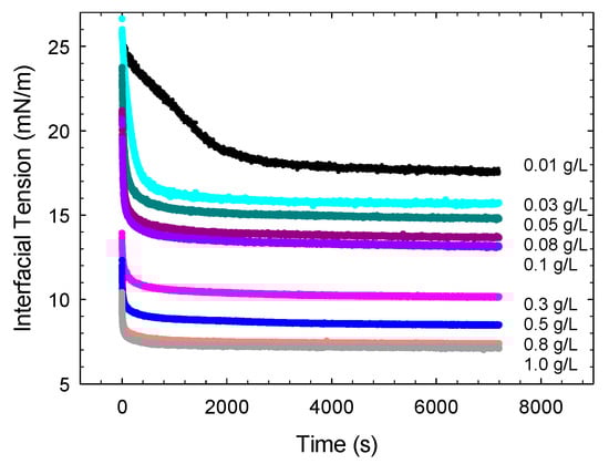 The interfacial tension of surfactant solutions against the MCT oil has been measured at various concentrations in water according to the method described in the previous section. In particular, the measurement of interfacial tension begins just after the formation of a “fresh” droplet interface—that is, an interface with an initially negligible amount of an adsorbed surfactant—and continues during the advancement of the surfactant adsorption process until the achievement of the equilibrium. This kind of measurements, apart from providing information on the adsorption kinetics such as, for example, the adsorption characteristic time, allows determining the equilibrium interfacial tension versus the bulk concentration, which characterizes the thermodynamic adsorption properties of an examined surfactant system. For all the cases investigated, after about two hours from the creation of the interface, the adsorption equilibrium may be assumed to be achieved, as the interfacial tension presents a variation lower than 1 mN/m in one hour. Figure 2 shows the interfacial tension versus time obtained for saponin at various bulk concentrations in water. The corresponding equilibrium interfacial tensions versus concentration are reported in Figure 3.