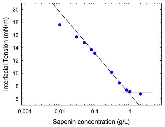 From Figure 3 the achievement of the critical micellar concentration around 0.8 g/L (4.8 × 10−4 M, assuming 1650 g/mol as molecular weight) is evident. This value is in agreement with that found for the same type of saponin in Reference [11], from surface tension measurements at water-air interface.