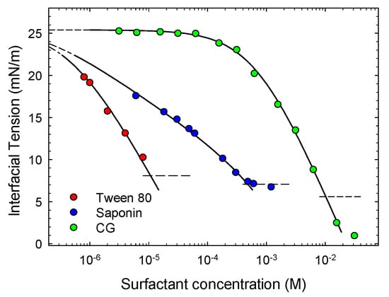 The partitioning can be especially relevant for Tween 80 and CG that are non-ionic surfactants, while, we can expect the transfer into the oil phase to be negligible for saponin. In fact, according to the results reported in Reference [11], for neutral pH, like in the present case, saponin is predominantly dissociated and behaves therefore as an ionic surfactant.