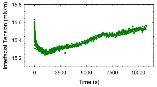 where T is the temperature and R the gas constant, which provides a value for the maximum adsorption of 2.6 ± 0.1 μmol/m2. This adsorption value is much lower than that found in Reference [11], for the water-air interfaces, that is 5.1 μmol/m2. This can be due to the lower affinity of saponin molecules with the water-oil interface or to a much higher occupational area of the adsorbed saponin molecules caused by a different placement of the saponin molecule at the interface between oil and water.