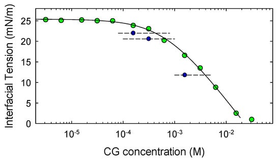 To evaluate the partition coefficient Kp = cw/cMCT, we have adopted the method described in Reference [40]. Accordingly, CG solution in MCT are prepared and the equilibrium interfacial tensions measured using a pendant drop of initially pure water immersed in such solutions. The comparison of these data with the adsorption isotherm obtained in the opposite configuration, that is, equilibrium interfacial tension versus concentration in water, provides for each value of the interfacial tension (see Figure 6) the two concentrations in partition equilibrium. Using the data in Figure 6, the partition coefficient of CG was estimated as Kp = 0.42 ± 0.05, where the value and the uncertainty are obtained by the average of the Kp’s determined by the couples of concentrations at the various interfacial tensions.