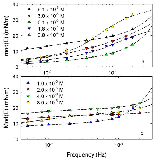 The dilational viscoelasticity versus frequency of the above-investigated systems has been measured according to the oscillating drop method, as described in Section 3.2, in a range of concentration in water below the cmc where the concentration dependence of the equilibrium interfacial tension is appreciable. Figure 7 reports the results obtained for saponin and Tween 80. For CG, lower values of the dilational viscoelasticity modulus were found, around 4 mN/m and below, without a significant trend with frequency and, for this reason, they are not reported in Figure 7.