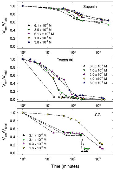 In all the cases reported a total emulsification of the samples was observed, that is, Vem/Vtotal = 1 at the initial time of the emulsion monitoring. Afterwards, emulsions evolve with different trends depending on the surfactants used. As shown in Figure 8, saponin-stabilized emulsions present a slow reduction of the volume during the first two days from the formation, with a slight dependence on the concentration. For the lowest concentration investigated, that is, 6.1 × 10−6 M, a small volume of MCT phase starts to separate after about one day from the formation, reducing the emulsion volume. For the higher concentrations, instead, the MCT phase remains totally emulsified for several days (more than 15), with the relative emulsion volume which after the reduction of the first two days maintains constant at Vem/Vtotal ≈ 0.6. The fact that no separated oil phase appears means that coalescence of MCT droplets is hindered by saponin adsorbed layers and the initial reduction of the emulsion volume is mainly due to an increased droplet compactness related to the aqueous phase drainage.