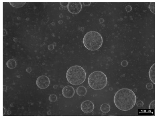 Tween 80-stabilized emulsions are appreciably less stable than those with saponin. This is not only evidenced by the faster reduction of the emulsion volume (see Figure 8) but also by the fact that, for all the concentrations studied, a separated oil phase appears and grows on the top of the emulsions already after 10 min from the formation. This means that Tween 80 under these conditions is not an efficient stabilizer against coalescence. The emulsions stabilized by CG present a more complex behavior where the time evolution of the emulsion volume significantly depends on the concentration. For this surfactant, like for Tween 80, the reduction of the emulsion volume is associated with the appearance of a separated MCT phase meaning that, also in this case, the droplet coalescence has an important role in the destabilization. Moreover, as evident from Figure 8, only for the emulsions obtained with the highest concentration, that is, 1.6 × 10−3 M, the destabilization is rather slow, during the monitoring time. For the other concentrations investigated, the emulsion volume is reduced by half in about ten minutes maintaining rather constant for several hours before a drastic fall after about one day. In correspondence with this abrupt volume reduction the appearance of a new turbid thin phase is visually observed, just above the emulsion, below the separated MCT phase, with a small volume not easy to evaluate. This particular behavior of the CG-stabilized emulsions as well as the appearance of this new phase during their evolution, is possibly related to the solubility of this surfactant in both water and oil phases. On the basis of the value of the partition coefficient indicated in the previous section, one can suppose that the new phase observed could be a water-in-oil emulsion coexisting with the principal oil-in-water ones. The analysis of these latter ones by optical microscopy gives information that support this hypothesis. In fact, from the image reported in Figure 9 of a typical emulsion obtained with CG, it is evident that a multiple emulsion is produced, where the droplets are, in turn, a disperse water-in-oil phase.