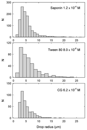 Examples of drop radius distributions from the microscope images acquired just after emulsification for the different surfactants.