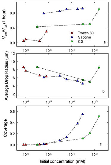 In order to summarize the properties of the emulsions obtained with the different surfactants, we report in Figure 11 the relative emulsion volume, Vem/Vtotal, reached after one hour from the formation as a function of the surfactant concentration in water before emulsification (panel a) and the corresponding average droplet radius obtained from the size distributions by microscopy analysis (panel b). Apart from the highest concentration of CG, these data evidence a slight decrease of the average droplet size with the concentration and a general tendency to improve the stability with the decrease of the droplet size.