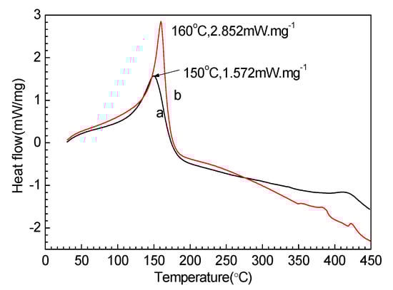 In order to discuss the effect of RGO/NCC on the curing behavior of the TPU, the curing profiles of the pure TPU solution and RGO/NCC-TPU solution containing 1.5 wt% RGO was measured by DSC, as shown in Figure 2. Seen from Figure 2, the curing temperatures of the pure TPU solution and RGO/NCC-TPU solution containing 1.5 wt% RGO are 150 and 160 °C, respectively, which indicated that graphene improve the thermal stability of TPU. The total reaction heat of the pure TPU and RGO/NCC-TPU containing 1.5 wt% RGO is 1.572 mW·mg−1 and 2.852 mW·mg−1, respectively. It is indicated that RGO/NCC affect the curing behavior of TPU and reduce the cross-linking density.