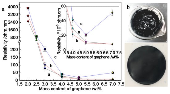 (a) Resistivities of RGO/NCC-TPU composite films with different mass contents of reduced graphene oxide (RGO) and TPU initial concentrations of 10 wt% (curve a), 20 wt% (curve b), and 30 wt% (curve c), respectively, and (b) photos of RGO/NCC-TPU slurry prepared with TPU initial concentrations of 20 wt% and 5 wt% RGO (above) and corresponding RGO/NCC-TPU composite film (below), respectively. The inset in Figure 3a is local magnification.