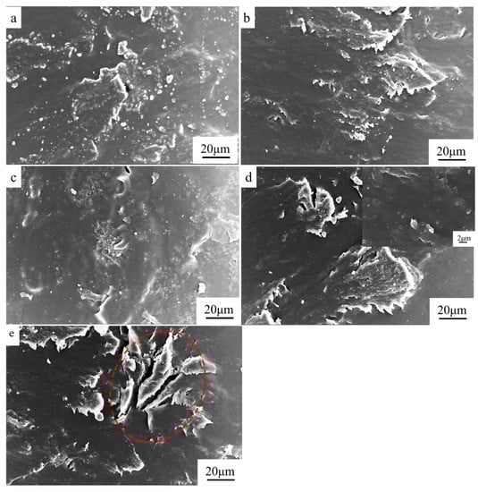 Figure 4 shows SEM images of surface morphology of the composite films prepared with the initial TPU concentration of 20 wt% and the mass content of RGO of 0.4, 1.5, 3.0, 5.0, and 7.0 wt%, respectively. It is clearly that the RGO/NCC are buried in the TPU matrices and exhibit grainy and rough characterization. With the increase of the mass content of RGO, the density of stacked RGO sheets increased, which is advantageous for forming the conductive pathways. When the mass content of RGO is 7.0 wt%, the clear cracks can be observed in the sample. This may be due to the higher content of graphene, which leads to greater internal stress in the composite film.