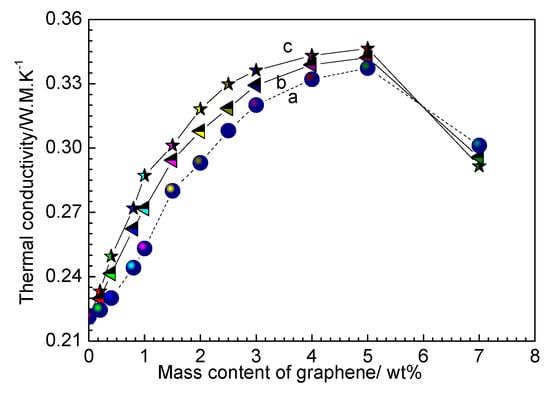 In order to reveal the effect of RGO on thermal conductivity of the composite film, we measured the thermal conductivity of the composite films with different mass contents of RGO and different initial TPU concentrations, as shown in Figure 6. The thermal conductivity of the pure TPU is about 0.2213 W·m−1·K−1 and the thermal conductivity of the composite film first increases and then decreases with the growth of the mass content of RGO in composite film. When the mass content of RGO reaches 5 wt%, the thermal conductivity of composite film fabricated with the initial TPU concentration of 30 wt% reaches a maximum of 0.3464 W·m−1·K−1, which increases by 56% when compared with that of pure TPU. When the mass content of RGO is less than 5 wt%, the thermal conductivity of the composite film with the same RGO mass content increases with the initial TPU concentration. However, when the RGO mass content is 7 wt%, the thermal conductivity of the composite film fabricated d with the initial TPU concentration of 30 wt% is the smallest. Many interfaces are produced when RGO sheets are added into TPU due to a very high specific surface area of RGO sheets [36]. These interfaces result in phonon scattering and introduce interfacial thermal resistance. RGO is a highly thermal conductive channel in the composite film. When the mass content of RGO is below the percolation threshold, RGO cannot connect together to form a thermal conduction pathway. In this case, the interfacial thermal resistance of RGO and TPU is the main factor determining the thermal conductivity of the composite film. While the mass content of RGO is above the percolation threshold, the heat in the composite film mainly transfers through the thermal conduction pathways due to the high thermal conductivity of RGO, and the thermal conductivity of the composite film increases significantly. However, when the mass content of RGO is too high, RGO sheets tend to form a large number of aggregates, which makes it impossible to form effective thermal channels, so that the thermal conductivity decreases [21,37,38,39].