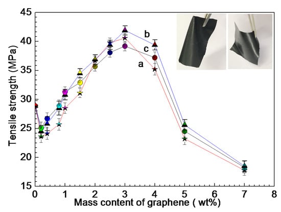Tensile strength of RGO/NCC-TPU composite films with different mass contents of RGO/NC and TPU initial concentrations of 10 wt% (curve a), 20 wt% (curve b), and 30 wt% (curve c), respectively. The insets in Figure 7a are samples.