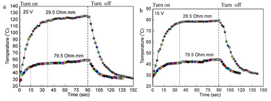 In recent years, the electrothermal response performance of conductive films has also aroused the interest of researchers due to the potential application of conductive film as a flexible electro-thermal heater [40,41,42,43]. In this study, we investigated the electrothermal response performance of the RGO/NCC-TPU conductive film by applying direct current (DC) voltage-stabilized power in a laboratory environment. The RGO/NCC-TPU conductive film was made through two clips coated with copper foil that contacted the film edges as electrodes. Figure 8 shows a plot of temperature versus time for the RGO/NCC-TPU conductive films with resistivity of 29.5 and 79.5 Ω·mm, respectively, under the operation for input voltage of 20 (Figure 8a) and 15 V (Figure 8b), respectively. The experimental results reveal that the temperature increases linearly in 10 and 20 s for the films of 79.5 and 29.5 Ω·mm, respectively, and, thereafter, the temperature increases slowly with time until it reaches a steady state temperature, which confirms the fast electrothermal response performance. The state temperatures of the films of 79.5 and 29.5 Ω·mm are 54.5 and 120.7 °C, respectively, under the operation for input voltage of 20 V, and are 42.4 and 78.3 °C, respectively, under the operation for input voltage of 15 V, respectively. The experimental results indicate that the efficient transduction of electrical energy into Joule heating is caused by the good conductivity of the composite film. The results, therefore, demonstrate that the composite film is suitable for applications in the field of the fast temperature switching with low input voltages. It can be seen from the above experimental results that the electrothermal response of the RGO/NCC-TPU conductive film is similar to that of the flexible transparent conductive AgNWs film [44]. However, under the same conductivity conditions, the thermal efficiency is low among flexible transparent conductive AgNWs film [44]. The reason may be that the Joule heating energy is consumed when the RGO transfers heat energy through the TPU matrices.
