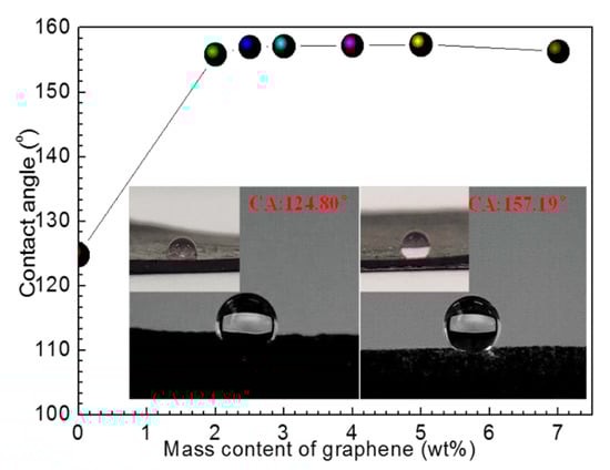 Due to the characteristics of TPU material, the RGO/NCC-TPU conductive film is susceptible to environmental humidity. We considered fabricating the superhydrophobic layer on the surface of the conductive film to improve the humidity effect of materials. Figure 9 shows the water contact angle (CA) of the RGO/NCC-TPU conductive films with different mass contents of RGO. The insets are photos of the water contact angle of the pure TPU and composite film with 4 wt% of RGO. The water contact angle of the pure TPU is about 124.90° and increases to 155.82° after adding 2 wt% of RGO into composite film, which displays a superhydrophobic characteristic. With the increase of the mass content of RGO in the film, the water contact angle of the composite film slightly increases and is 157.19° when the mass content of RGO in the composite film is 4 wt%. The hydrophobic F-POSS molecules deposits not only on the composite conductive film surface, but also penetrates deeply into the composite film. Therefore, the hydrophobicity of the conductive composite film is greatly improved.
