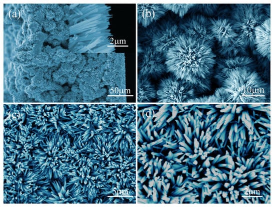 Figure 3 shows the microtopography of TiO2 nanoarray that places the FTO conducting glass into the reaction vessel vertically at 180 °C for 4 h. Figure 3a,b shows the front view of TiO2 nanoarray grown on conducting glass substrate. As can be seen in Figure 3a,b, there are stacked sea urchin-shaped TiO2 nanoarrays on the surface, with different sizes and dense arrangement. The length and diameter of the nanorods are basically equal in the same urchin-shaped TiO2 nanoarray. The inset in Figure 1a is the cross-section diagram and enlarged view of TiO2 nanoarray generated on the FTO conducting glass. It can be clearly seen that the TiO2 grown on the horizontally placed conducting glass is composed of TiO2 nanorod arrays and urchin-shaped TiO2 nanoarrays that are in contact with the bottom surface. The two kinds of nanoarrays with different morphologies are combined to form the homojunction of the TiO2 nanoarray (recorded as TiO2 –HJ, HJ: Homojunction), and the thickness of the homojunction of the TiO2 nanoarray is between 150 and 200 mm. Figure 3c,d shows the reverse side of the TiO2 grown on the FTO conducting glass and their enlarged views. The reverse side indicates the contact surface between TiO2 nanoarray and conducting glass. As can be seen in Figure 3c,d, the nanorods are arranged in order with the diameter of 600 nm and the vertical extent of the TiO2 nanorod array is obviously improved when the FTO conducting glass is placed vertically.