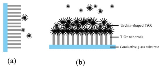 Moreover, it can be found that under the same hydrothermal conditions, the homojunction is formed when the conducting glass is placed horizontally in the reaction vessel, while only nanoarray is formed when the conducting glass is placed vertically. Under certain temperature conditions, the TiO2 generated by hydrolysis nucleates on the conducting glass and continues to grow into nanorods after nucleation. When the nanorods grow to a certain length, the hydrolysis reaction continues to produce a large amount of TiO2. TiO2 grows into urchin-shaped-like TiO2 nanoballs in solution. A large amount of TiO2 exceed the growth rate of TiO2 nanorods along the vertical direction on the conducting glass and falls directly on the TiO2 nanorods that have been already generated, which forms the titanium dioxide nanoarray homojunction. The schematic diagram of the formation mechanism is shown in Figure 5a shows the schematic diagram of the formation of TiO2 nanoarray when the conducting glass is placed vertically. Figure 5b indicates the schematic diagram of the homojunction of TiO2 nanoarray when conducting glass is placed horizontally.