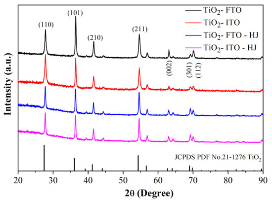 X-ray diffraction (XRD) characterization is presented in Figure 7. It can be seen that the TiO2 with four morphologies have crystal faces of (110), (101), (002), (301) and (112), which indicates that the crystal structures of TiO2–FTO, TiO2–ITO, TiO2–FTO–HJ and TiO2–ITO–HJ are tetragonal rutile phase [27]. The (101) diffraction peak of TiO2 grown on FTO conducting glass substrate is the strongest and sharpest, which suggests that the structure order degree of TiO2–FTO was improved by FTO [26,27].