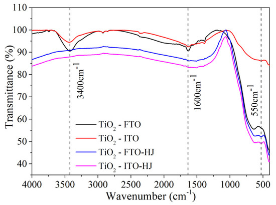 It can be seen from the FT–IR spectrum of TiO2 nanoarrays in Figure 8 that a weak absorption appears at the wavenumber of 3400 cm−1 the TiO2 grown on the FTO and ITO conducting glass substrates. The weak absorption of 3400 and 1600 cm−1 is the characteristic absorption of hydroxy (–OH), which may be due to the incomplete hydrolysis of titanium tetrachloride (TiCl4) to generate TiO2 and residual –OH. The characteristic bands at 550 cm−1 are attributed to vibrations of Ti–O in TiO2 nanocrystal.
